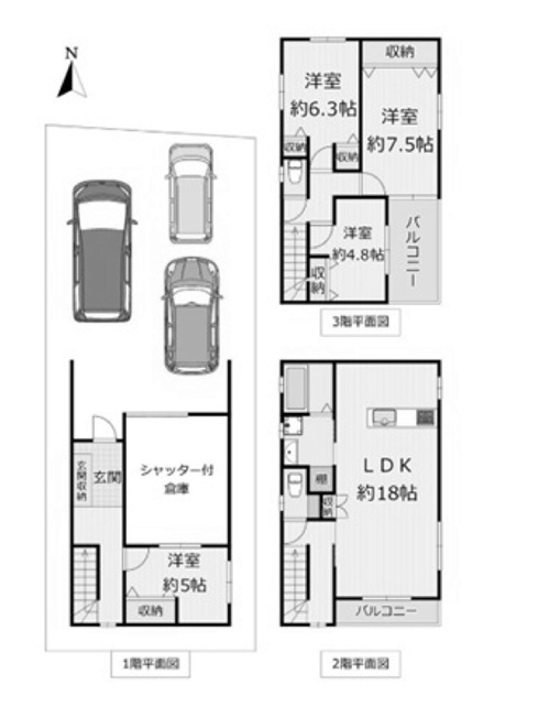 愛車も仕事道具もゆったり収納! 駐車3台以上+シャッター車庫&1階倉庫利用可の多用途住宅 南向きバルコニー×18帖LDK。 全居室フローリングで心地よく、駐車3台以上可のゆとり邸宅