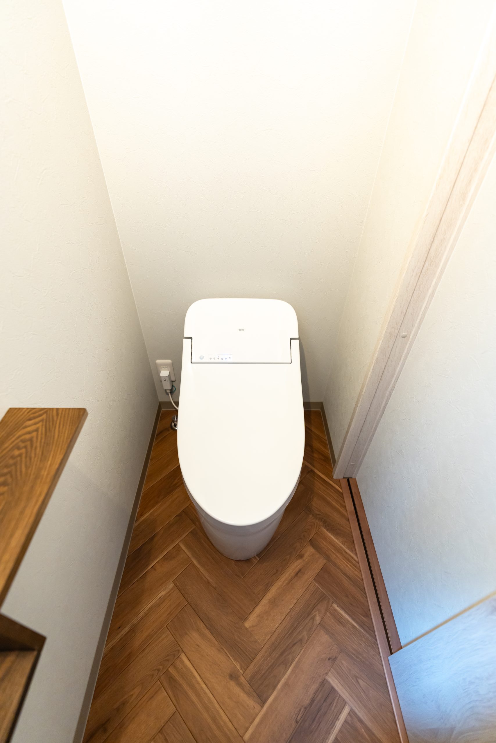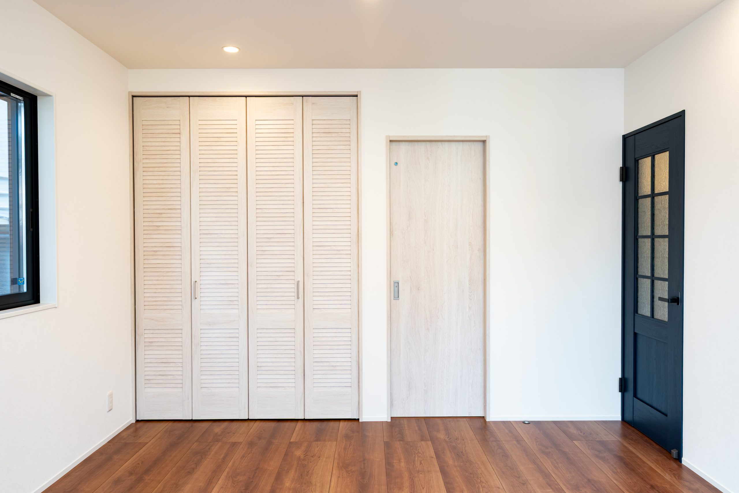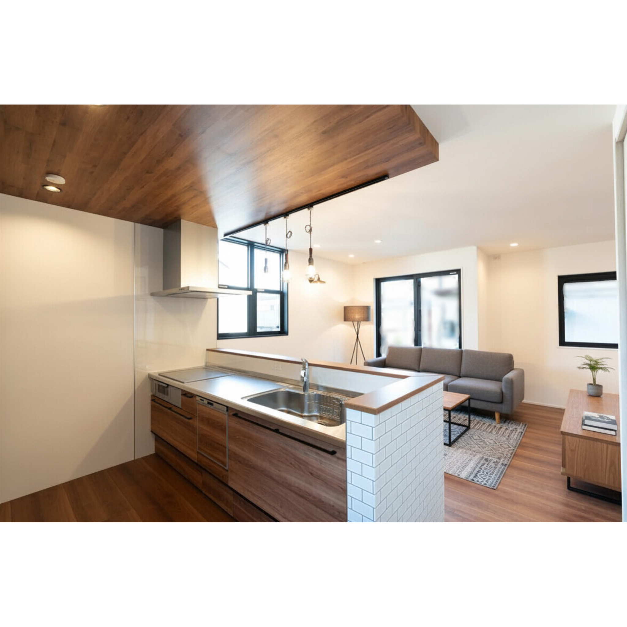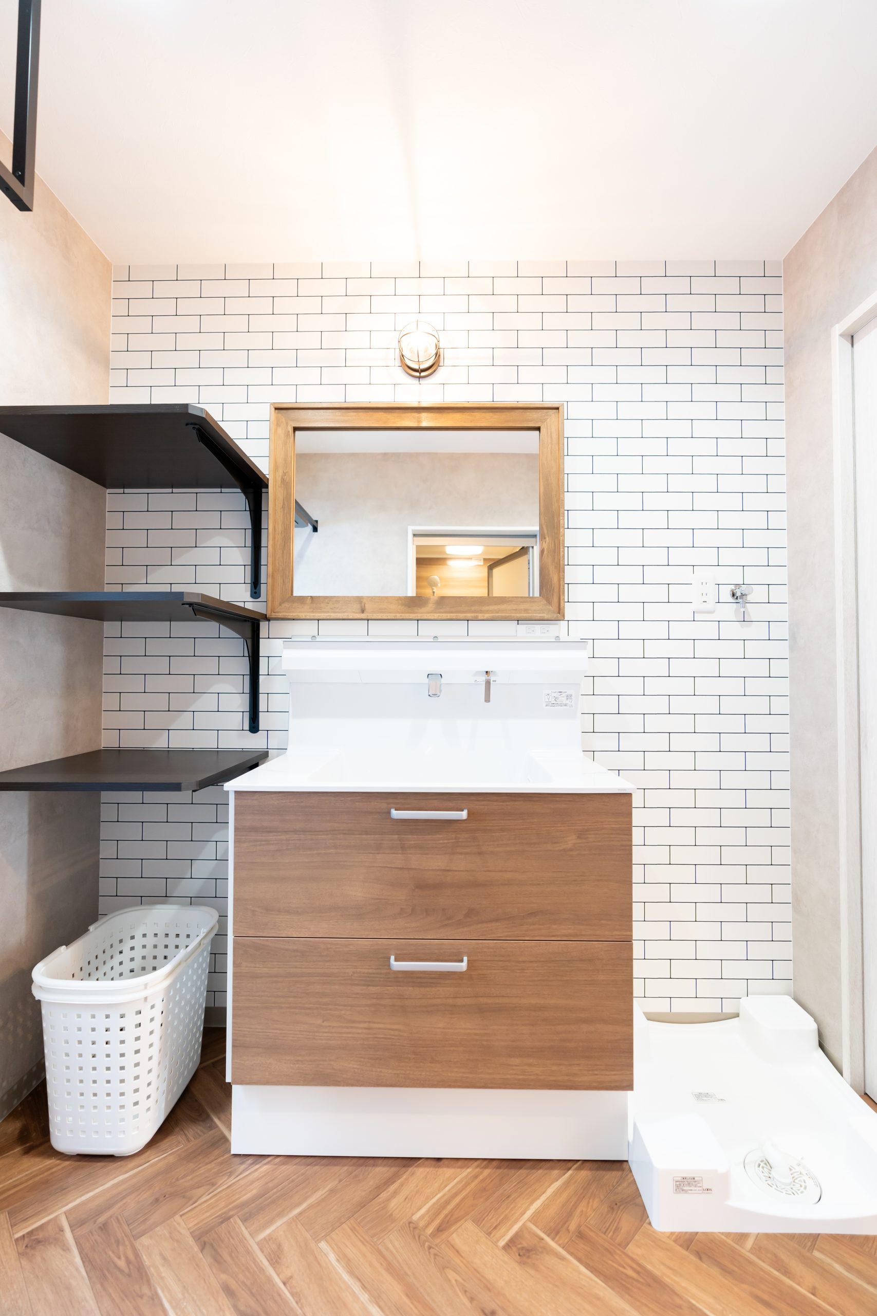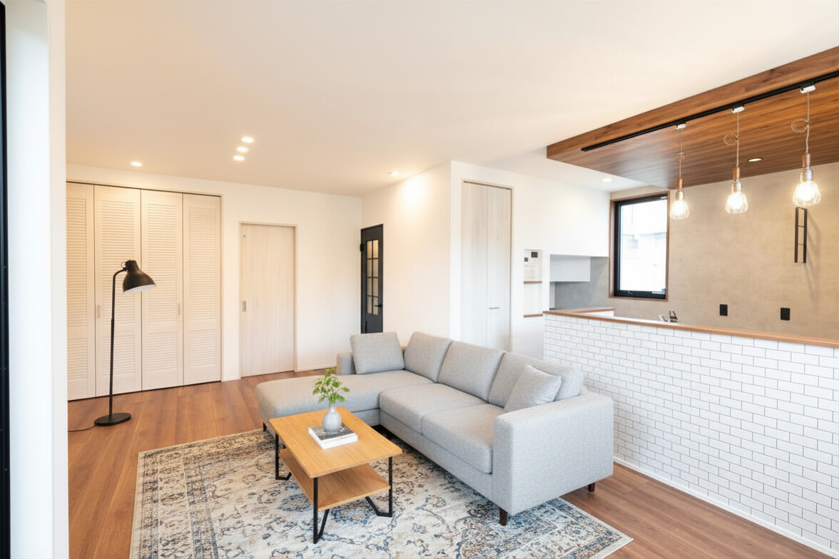 白を基調としたクリーンな空間に、ネイビーのドアやヘリンボーン柄の床でアクセントをプラス。海外のカフェのような「見せる楽しみ」と、ルーバー扉の収納など機能性を両立させた、遊び心と暮らしが調和する、大人カジュアルな家。※家具、インテリアはイメージです。